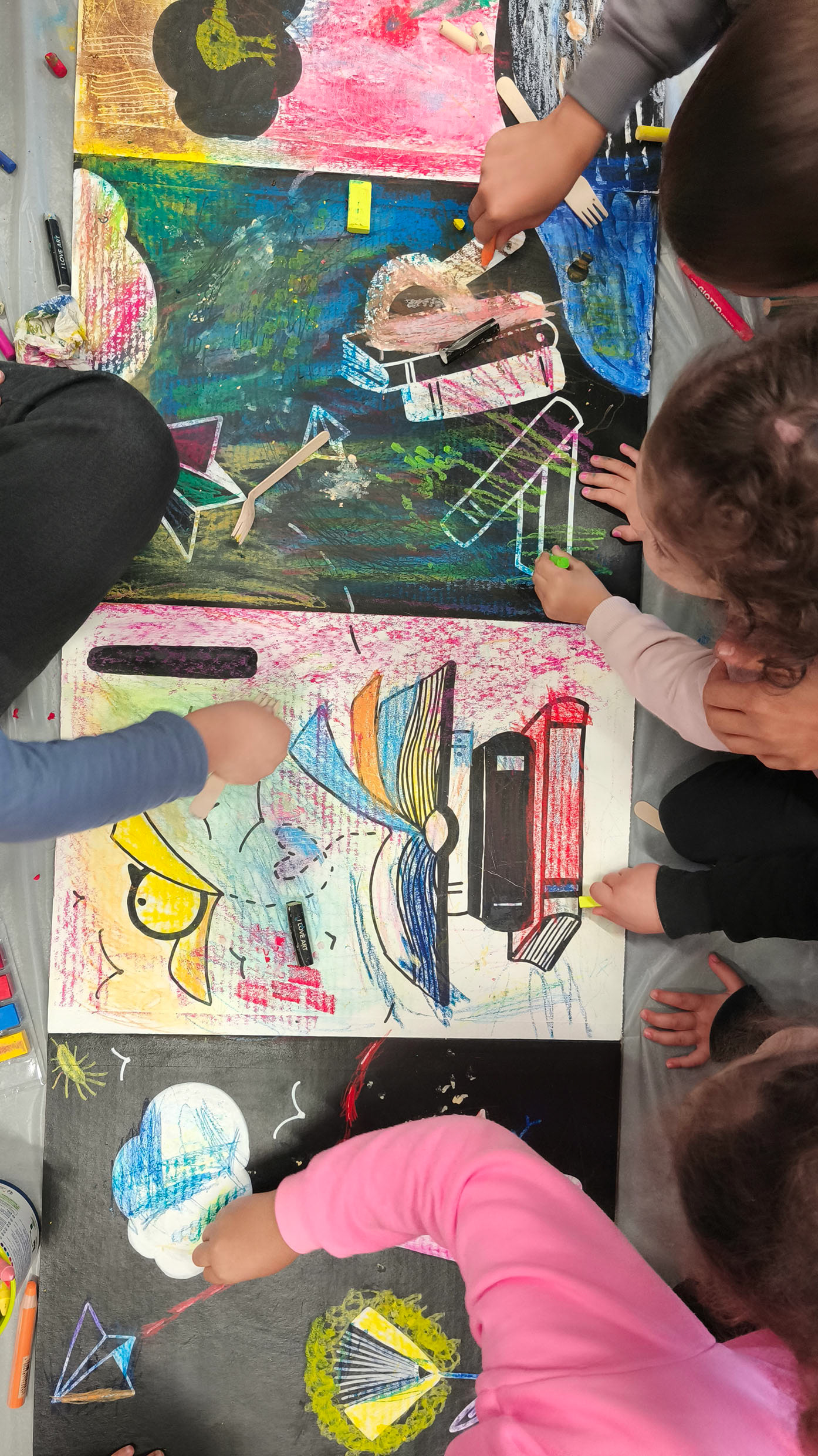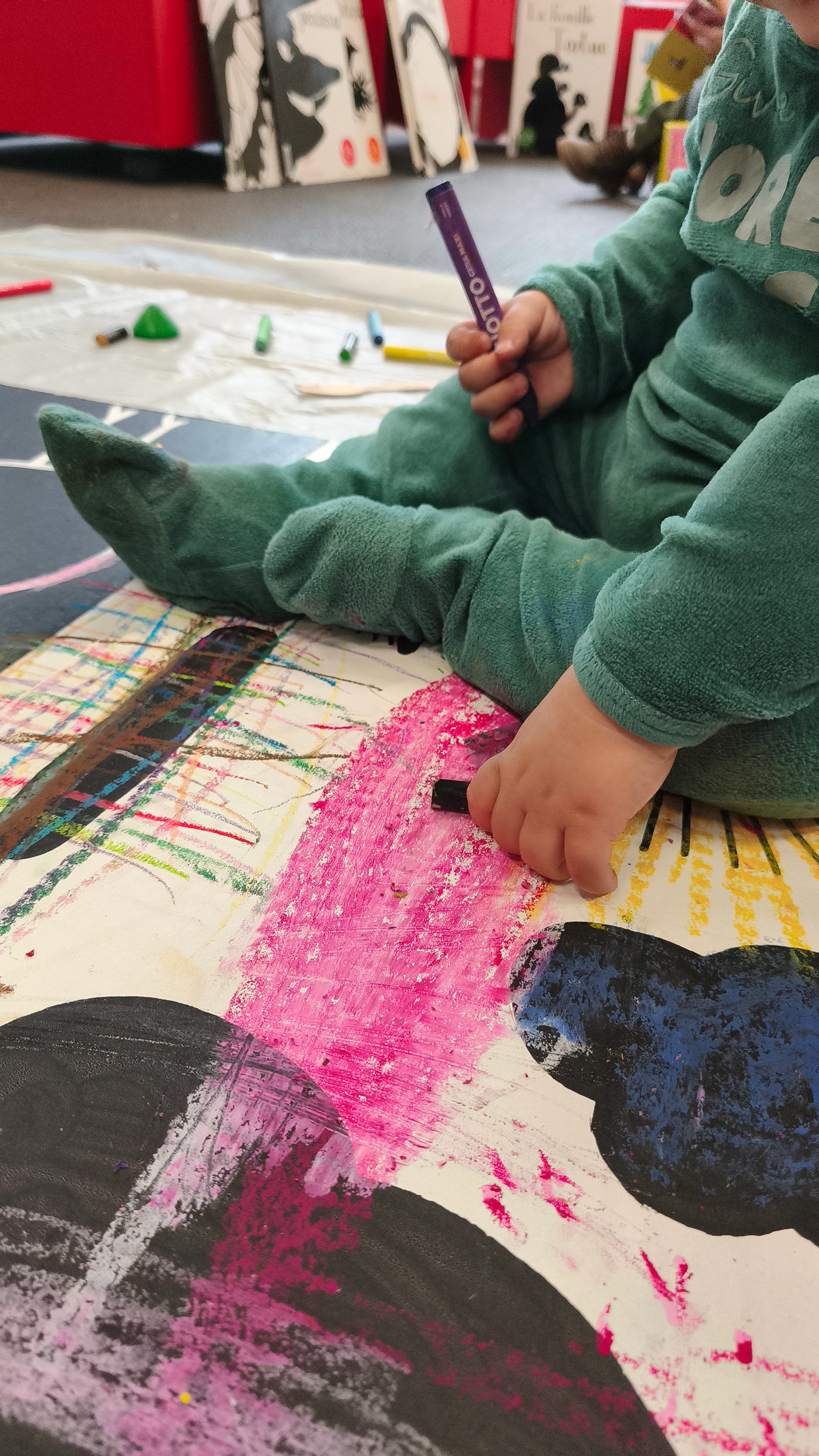 Cette colorisation collective est un espace d'expression sensoriel libre. J'invite le tout-petit et sa famille à s'amuser à explorer, tester, essayer, manipuler, aller et venir, observer, recommencer... librement, à leur rythme et à leur façon. Il n'y a pas de résultat attendu. L'important se situe dans l'expérience vécue.